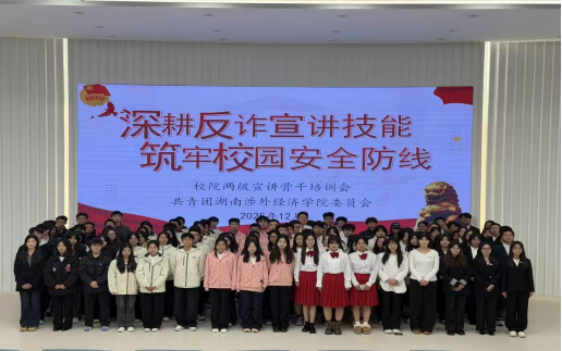 为强化校园反诈宣讲队伍能力,凝聚校院协同反诈合力,切实筑牢校园安全防护网,12月3日,共青团湖南涉外经济学院委员会于学术讲堂成功举办“防范意识刻于心 全民反诈我先行”校院两级宣讲骨干交流会,各二级学院宣讲骨干、校级组织主要干部共200人参会。
