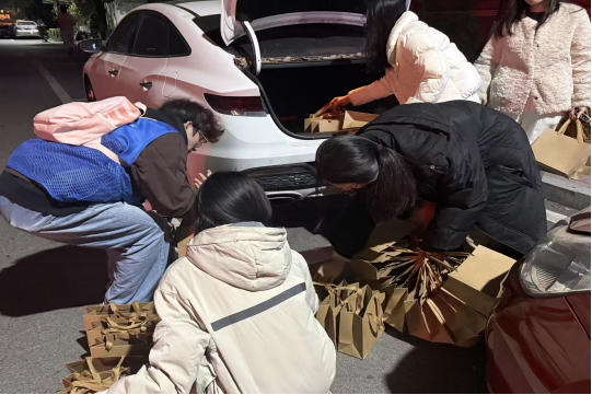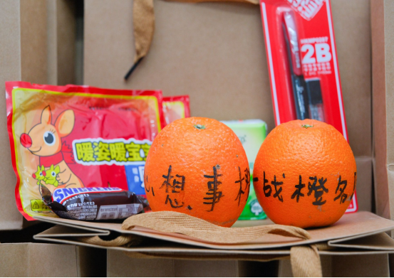 为了让考研学子感受到学院的贴心关怀,音乐学院在礼包筹备上格外用心。礼包里,印着“心想事橙”“一战橙名”的橙子成为“主角”,谐音梗的美好寓意暗藏着学院对学子的诚挚祝福。2B铅笔、橡皮等考试必备文具,是为学子们应对考场的细致考量;暖宝宝、巧克力等物品,则为冬日里埋头备考的学子送上温暖与能量。当学子们接过这份沉甸甸的礼包,小小的教室瞬间被温情所填满。