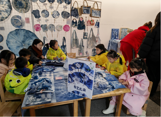在学前教育专业学子的引领下,麓谷公馆幼儿园的孩子们走进布艺扎染体验区,开启了传统工艺的沉浸式体验之旅。学子们全程陪同孩子们参观展区内的扎染作品,引导孩子们观察织物的色彩搭配与纹理特点;在实践环节,学子们耐心协助孩子们进行布料折叠、绳结捆绑等操作,及时回应孩子们的需求,保障体验过程安全有序。孩子们专注投入于动手实践,在亲身体验中感受扎染工艺的独特乐趣,而学前教育学子也以专业的陪伴与引导,践行着以儿童为本的教育初心,让这场参观实践成为连接传统工艺与幼儿成长的有益纽带。