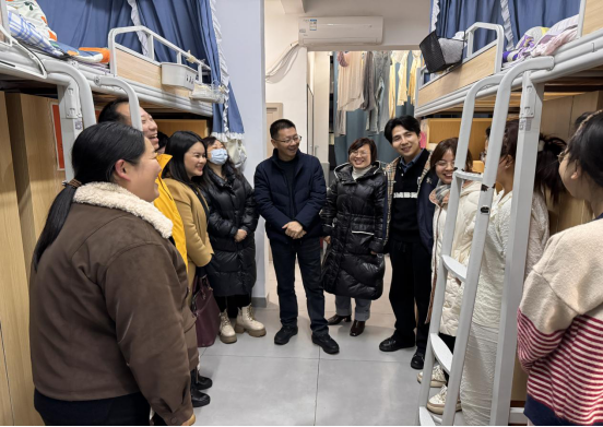 为深入了解2026届毕业生发展动态,进一步做好毕业生就业指导与服务工作,12月24日晚,商学院党总支书记廖立彬、工商管理系系主任刘滨睿、商学院大四年级组长(兼党总支副书记)刘娟、大三年级组长(兼组织员)龚红梅、大二年级组长彭芳(兼宣传员)、大一年级组长(兼团总支书记)肖卓,还有部分任课教师、辅导员代表,共同走进毕业生寝室,看望慰问毕业生,为他们送去学院的关怀与温暖。此次活动是学院推动教学管理与学生工作深度融合、协同育人的一次生动实践。