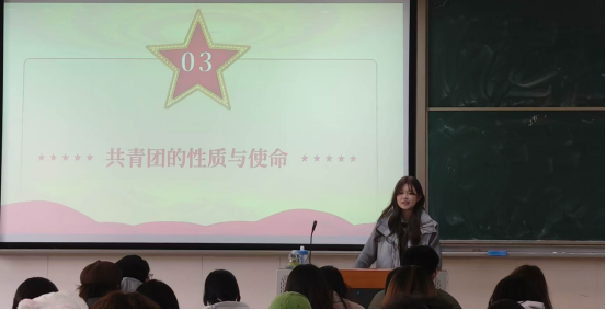 活动伊始,主讲人围绕入团的条件与程序、共青团的历史与发展、组织结构与工作、性质与使命四大核心板块展开细致讲解。从年龄身份、思想道德等入团基本要求,到提交申请、组织考察审批的完整入团流程,主讲人逐一清晰阐释;同时梳理了共青团从诞生到发展的百年历程,讲述五四运动为共青团诞生奠定的思想基础,以及团组织名称随时代发展的更迭变迁,让学员们深刻体会到共青团始终与时代同频、与祖国共进的使命担当。