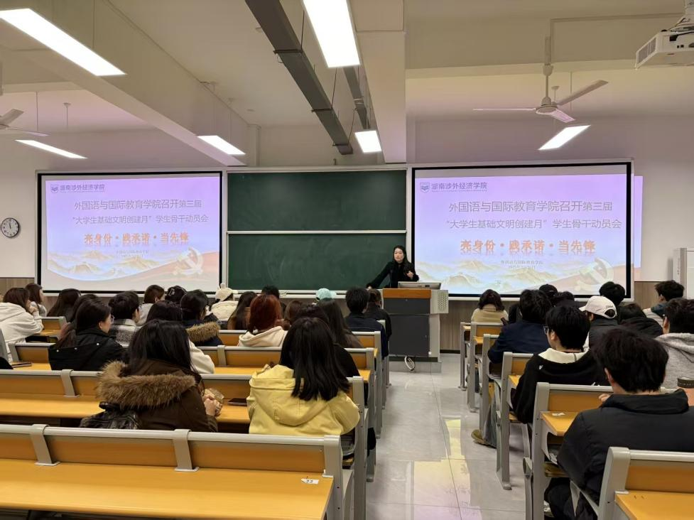3月25日中午,外国语与国际教育学院在五教105教室召开第三届“大学生基础文明创建月”学生骨干动员会。学院党总支副书记匡希茜出席会议并作动员讲话,各支部学生副书记、发展对象及主要学生干部参加会议。