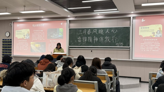 组织部干事黄紫依围绕雷锋精神内涵与新时代价值发表讲话,强调雷锋精神是严谨求实的学风、开拓创新的校风和奉献担当的社会风尚的集中体现,号召全体同学以行践知,将雷锋精神转化为服务他人、奉献社会的实际行动。提倡同学们走进校园、社区与敬老院,开展清洁美化、敬老陪伴、文明劝导等志愿服务,用点滴行动传递温暖,让雷锋精神在实践中闪光。