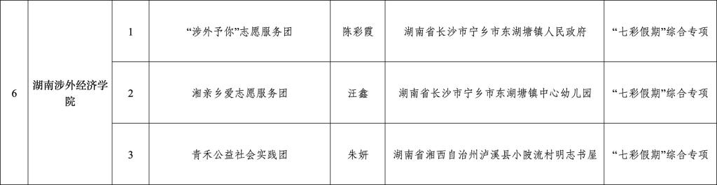 根据共青团湖南省委、湖南省禁毒委员会办公室、湖南省公安厅交通警察总队、湖南省青年志愿者协会《关于实施湖南省2025年青年志愿者关爱农村留守儿童“七彩假期”志愿服务项目的通知》,该活动自启动以来,得到了社会各界的广泛关注和积极参与。经团队申报、市州审核、省级评审复核等程序,我校以下团队和个人入选省级通报表扬名单,现予以校内公示: