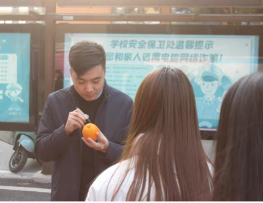 2025 年 12 月 9日,外国语与国际教育学院在第五教学楼前坪温情启幕“研途暖阳,筑梦同行” 考研学子关怀活动。学院执行院长、党总支书记许二鹏,校团委书记李术凯,学院党总支副书记匡希茜携多位系主任、辅导员代表共同到场,为全力冲刺考研的学子送上寓意吉祥的柑橘与手写祝福卡片,以冬日暖情驱散备考寒意,筑牢积极向上的备考氛围。