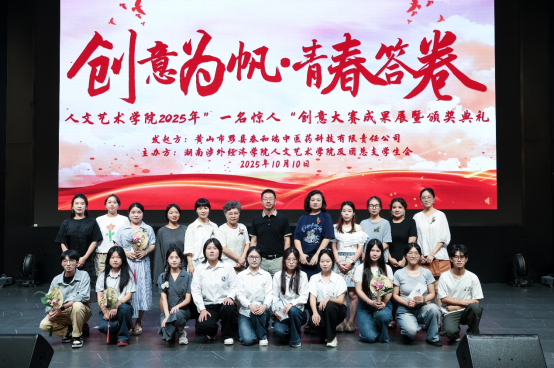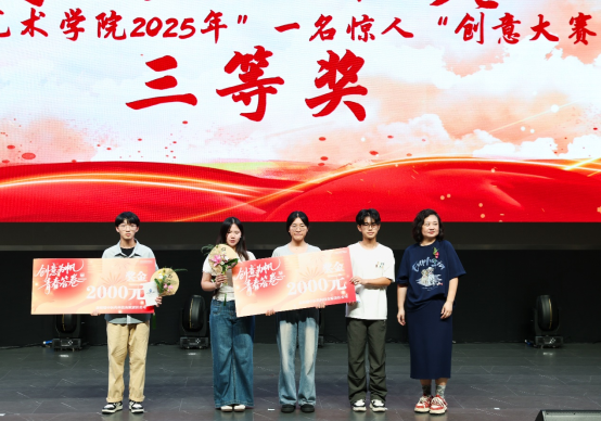 为展现本次校企合作的丰富成果,表彰人文艺术学院优秀学子在“一名惊人”创意大赛上大奇思妙想,大胆创新的出色表现。人文艺术学院2025年“一名惊人”创意大赛成果展暨颁奖典礼于2025年10月10日14:30在世纪讲坛圆满举行。伴随着暖场音乐视频的播放,本次典礼在热烈的氛围中拉开帷幕。