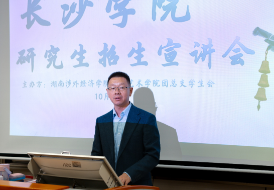 金秋十月,研途启新。此次活动以“破解艺术类考研信息壁垒、助力学子锚定升学方向”为核心,特邀长沙学院艺术设计学院副教授、硕士生导师黄薇老师,长沙学院艺术设计学院动画教研室主任韦蕴老师,人文艺术学院党总支书记廖立彬,以及大四年级各艺术类辅导员出席,于2025年10月14日下午,在湖南涉外经济学院人文艺术学院十一教225教室内,长沙学院研究生招生宣讲会顺利开展。协同发力,为大四年级艺术类考研学子搭建起“政策解读+备考指导+互动答疑”的一站式交流平台,让青春逐研之路更有方向、更有力量。
