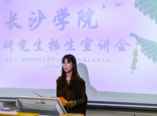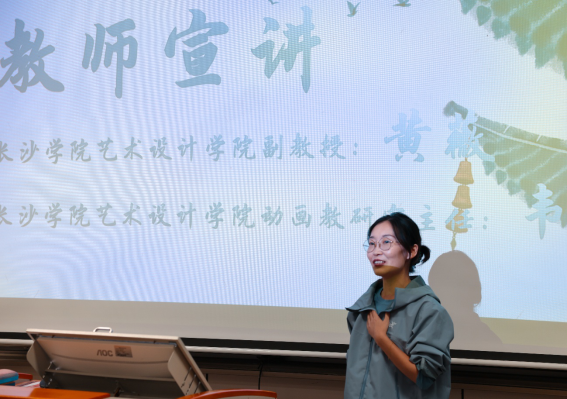 下午2时,宣讲会在人文艺术学院团总支书记龚钰婷的主持下正式拉开帷幕。作为人文艺术学院团学工作的核心负责人,龚钰婷书记首先结合当前艺术领域人才竞争态势,点明此次宣讲会的特殊意义:“在知识经济蓬勃发展的当下,考研不是‘逃避就业’的选择,而是艺术学子‘深耕专业、为创作与职业蓄力’的主动选择。之所以全力筹备此次活动,目的是为了帮大家打破‘信息差’,让每一份逐研的热情都能找到清晰的方向。”随后,她逐一介绍出席活动的嘉宾——长沙学院艺术设计学院副教授、硕士生导师黄薇老师,长沙学院艺术设计学院动画教研室主任韦蕴老师,人文艺术学院党总支书记廖立彬,以及大四年级各艺术类辅导员,现场学子以热烈掌声,向远道而来的师资团队及校内领导、老师致以欢迎。