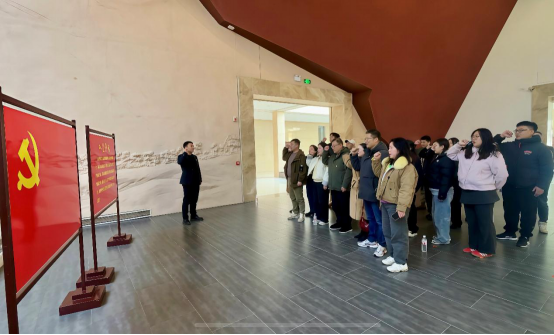 在纪念馆内的红色教育宣誓区,全体党员面向鲜红的党旗,举起右拳庄严宣誓。“我志愿加入中国共产党,拥护党的纲领,遵守党的章程...”铿锵有力的誓言回荡在展厅内,不仅是对革命先辈的深切缅怀,更坚定了全体辅导员牢记育人使命、坚守教育初心的信念。