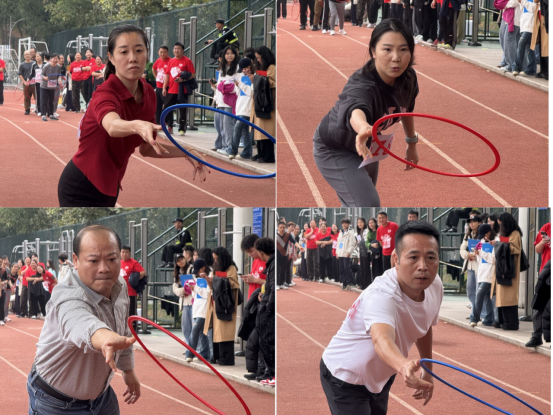 教职工比赛中,混合8×40米绕杆接力和套圈接力充满协作与趣味,青年教工立定跳远也赢得阵阵喝彩。