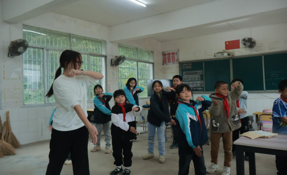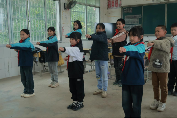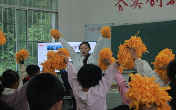 午后,原本安静的教室化身为充满活力的运动课堂。在啦啦操课上,支教队员清理出安全的活动空间,将复杂动作拆解为“手臂手位”“原地踮跳”等基础步骤,耐心地手把手教学。面对紧张忘动作的孩子,队员蹲下身来,一遍遍示范,用“再试一次,你超棒”的暖心鼓励帮助他们建立信心。很快,教室里便响起整齐的节拍与欢快的笑声。