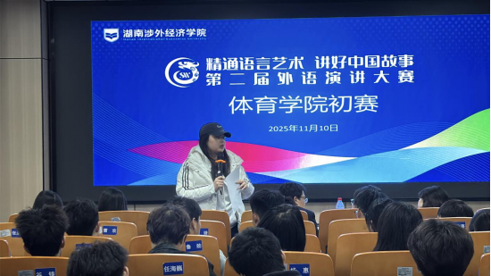 11月10日晚,湖南涉外经济学院体育学院于体育馆125多功能报告厅成功举办第二届“精通语言艺术,讲好中国故事”外语演讲大赛初赛。体育学院党总支书记王治国、党总支副书记李祥林、团总支书记陈蕾及全体辅导员出席活动,各班级学生代表到场观摩。