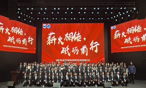 2025年12月9日,湖南涉外经济学院体育学院在世纪讲堂隆重召开学生组织换届暨表彰大会。学院党总支书记王治国、副院长刘云朝、党总支副书记李祥林、团总支书记陈蕾、心理协会指导老师李术容、综治安全部指导老师戴临江及全体辅导员一同参加。学院党员先锋队、团总支学生会、心理协会、公寓管理委员会、综治安全部五个学生组织全体学生干部齐聚现场,共同见证新老交接的重要时刻。